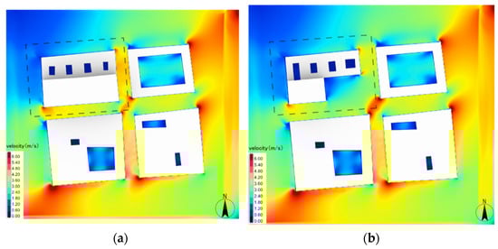 As shown in Figure 8a, for the clustered courtyard buildings (the building area within the black box in the figure), prior to renovation and upgrading, the majority of the accessible areas along the east and south streets of the clustered courtyard buildings experienced high wind speeds during the summer. In some sections of the east street, wind speeds exceeded the 5 m/s threshold for human comfort, while wind speeds along the east street ranged between 2.4 m/s and 6.0 m/s, creating stagnant wind conditions alternating with strong winds, resulting in an uncomfortable experience. As shown in Figure 8b, for the clustered courtyard buildings, after renovation and upgrading, wind speeds in the eastern street area of the square gradually decreased and stabilized within the range of 2.4 m/s to 4.2 m/s, falling within the comfortable wind speed range suitable for pedestrians to stand or rest for short periods. The open layout of the square facilitates rest and relaxation in this zone. The eastern edge of the square and the southern street area mostly have wind speeds within the comfortable range of 2.4 m/s to 4.2 m/s. Moving deeper into the newly opened square area, wind speeds decrease to the low wind speed range. Clearly, the wind environment quality of the clustered courtyard buildings improved after the renovation strategy was implemented, better aligning with human wind comfort requirements.