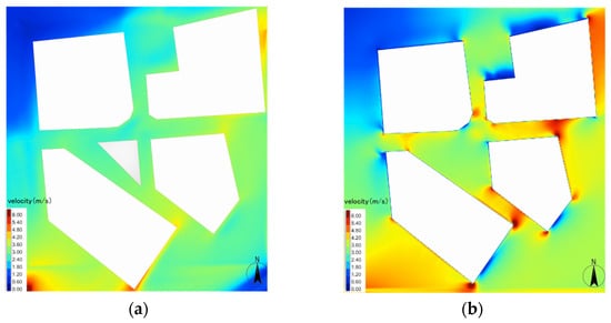 (a) Wind speed cloud map of the courtyard building district at a height of 1.5 m above ground level before the update. (b) Wind speed cloud map of the courtyard building district at a height of 1.5 m above ground level after the update.