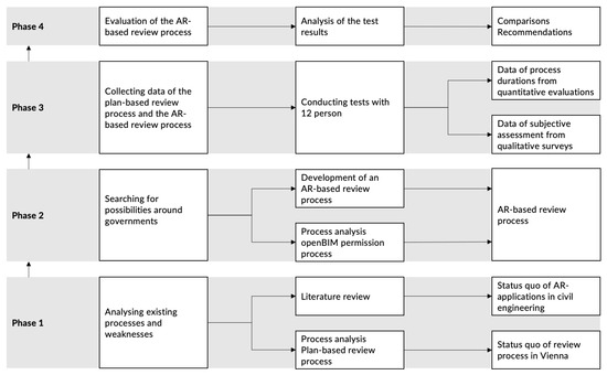The methodological approach is shown step-by-step in Figure 1. First, the traditional, plan-based review process is described to create a basis for comparison with the newly introduced AR-based method. Then, detailed descriptions of the AR platform, digital models, and specific functions developed for the review process are provided. Finally, the test setup is explained, including the selection of test participants, the construction projects used, and the process steps carried out.