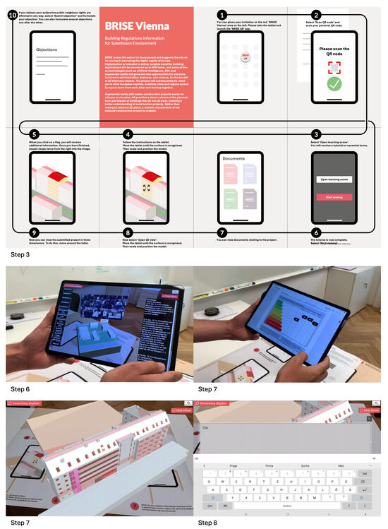 The use of AR is an important part of the EU-funded BRISE-Vienna project. Augmented reality is a form of extended reality (XR). The different levels of XR have been defined by Milgram and Kishino [36], including virtual reality (VR), mixed reality (MR), augmented virtuality (AV), and augmented reality (AR). According to Azuma [37], AR has three characteristics: the combination of real and virtual environments, real-time interaction, and three-dimensional localisation. In particular, AR enhances the real environment with virtual elements. Basically, two approaches can be distinguished with regard to the application of AR: on one hand, AR can be implemented by projecting virtual elements into the field of vision (e.g., using a Microsoft HoloLens) or by recording the environment with a camera and combining it with a (virtual) display (e.g., tablets, Apple Visio Pro). In principle, there are many AR integration possibilities for public authorities [19]. The case study reported here focused on implementing AR using tablets, allowing a virtual building model to be placed in the room using a reference surface. Additional virtual volumes can be displayed to indicate permissible building areas. Further documents relating to the submission can be accessed in static PDF format. The AR app’s functionality could also be implemented using a 3D viewer on a tablet or computer. The complex implementation of the AR application in the course of our case study was intended to provide the authority with a proof-of-concept. In the medium-term, AR viewing is planned for implementation independently of the authority at the respective construction site. A detailed description of this AR variant can be found in Gerger et al. [19].