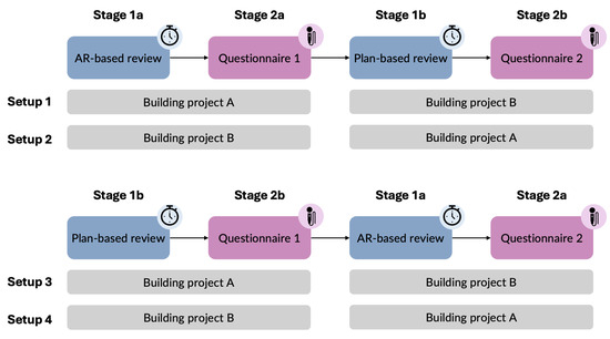 To ensure the validity of the data, two independent parameters (building project, review type)—each with two possible values—were varied during the tests (see Figure 5). This resulted in test setups. The varied parameters included: