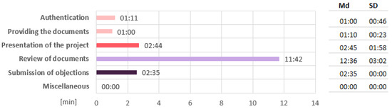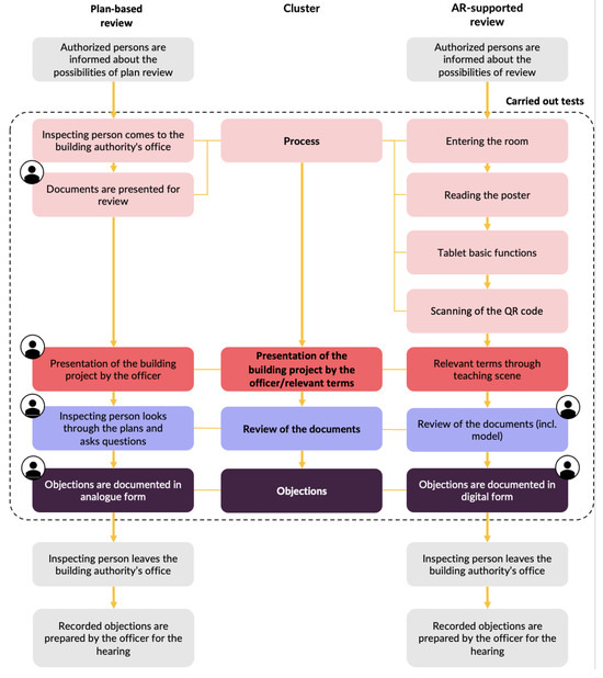 The dotted box indicates those steps that are directly part of the review, and therefore were considered as part of the tests; the person symbols indicate the steps that cannot be performed without an officer. As the processes are different, their individual steps are not directly comparable. For this reason, steps with the same content were clustered into four common process stages: process, presentation of the construction project/definitions, document review, and objections. In the test, the durations of the individual process steps were measured, then assigned to the appropriate cluster. It is clear that the process-oriented steps prior to the actual presentation of the construction project differ between the plan- and AR-based reviews; these individual steps have, therefore, been clustered into the “Process” category. While the plan-based review begins with authentication and the provision of documents, the AR-based review primarily explains the process and how to use the tablet. The initial information required in the traditional plan-based review process has already been described in detail in [31]. The data collected during the tests included the processes and process durations, which were determined based on expert surveys and further validated based on the tests carried out.