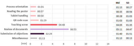 Figure 7 and Figure 8 show the recorded process durations. The durations in minutes per process step are shown graphically on the left (expressing the arithmetic mean values (aM)), while the median (Md) and standard deviation (SD) are plotted on the right. The colour of each process step refers to those used in Figure 6.