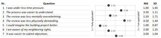 It can be seen that there were significant differences in the participants’ assessment of mental and physical strain. People with a construction background are used to the “language of plans” and often have a good spatial imagination. For these reasons, the improvement in mental stress was only marginally improved with AR (aM 2.83, Md 2.50). For people without previous construction knowledge, the “language of plans” is often more challenging to understand, and these participants rated the use of AR via tablet as more mentally relieving (aM 2.17, Md 1.50) but more physically demanding (aM 3.33, Md 4.00). Both groups rated the support in visualising the construction project similarly (aM 1.67, Md 1.33). People with no previous construction experience rated the added value of AR slightly better. There were no significant differences in their understanding of the law and the possibility of raising objections.
