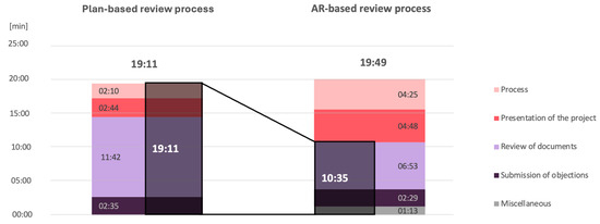In the quantitative evaluation, the process duration of the AR-based review was compared with that of the plan-based review; for this purpose, the authors measured the elapsed time for each process step. Figure 6 compares the evaluated processes for the plan- and AR-based reviews.