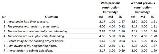 The qualitative evaluation results were presented in the Qualitative evaluation section. However, the composition of the test group may have led to a distorted picture, due to the disproportionately high number of participants with previous construction knowledge. Typically, the building authority’s plan-based review process (for neighbours) is almost exclusively attended by people without civil engineering or architectural knowledge. For this reason, Figure 13 divides the results according to the participants with and without prior construction knowledge.