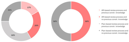 In a final question, the respondents were allowed to choose between the forms of review processes: “Which method would you choose in future?” Figure 14 shows the results regarding this question, which also present apparent differences depending on previous construction knowledge. People with previous construction knowledge rated the lower information content of AR more negatively than the comparison group. For this reason, two-thirds of those with prior knowledge would continue to opt for conventional plan-based review process. Overall, AR was seen as having more of a supplementary role with respect to the plans. In contrast, the decision was 50:50 for those with no previous construction experience.