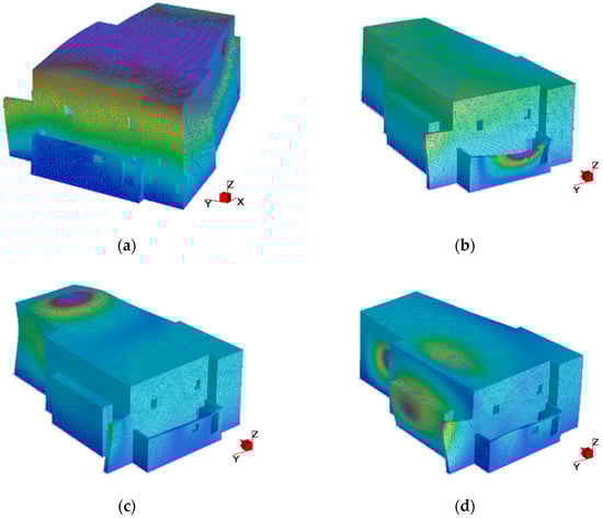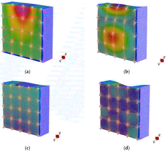 The detailed analysis of the tegulae mammatae system revealed significantly higher frequencies compared to the overall structural response, reflecting the local nature of these facade elements and their connection to the main structural system. The representative four-by-four tile section demonstrated fundamental frequencies in the range of 87.59–294.52 Hz, substantially higher than the building-scale response. The results of the analysis conducted on the radiant wall portion are reported in