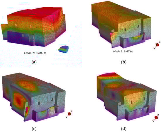 Computed frequencies fall within ranges consistent with similar masonry structures documented in the literature, providing confidence in the numerical model’s validity. The predominance of translational modes in the fundamental response indicated that the structure behaves as a relatively unified system rather than exhibiting localized flexibility that might indicate structural degradation.