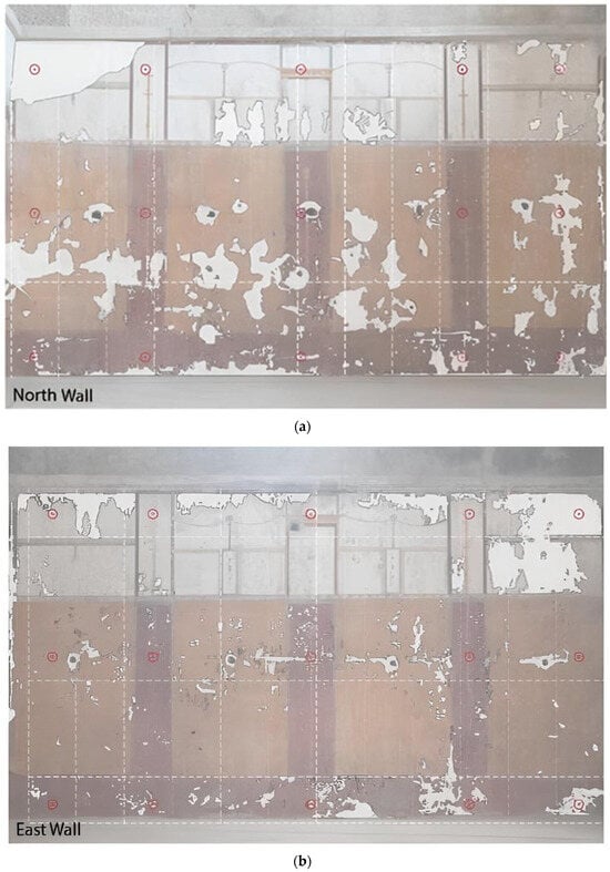 Based on visual inspection and conservation constraints, preliminary sensor locations have been identified, considering the preservation state of the frescoed surfaces. The measurement points have been selected in areas where plaster deterioration allows access to the underlying structural elements without compromising intact decorative surfaces.