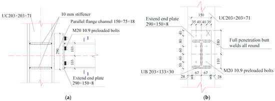 All the specimens adopted the same geometric dimensions, including a span of 3120 mm. British Universal Beams [39] UB 203 × 133 × 30 and British Universal Columns [39] UC 203 × 203 × 71 were employed for the sections of steel beams and steel columns, respectively. The extended reverse channel connection consisted of a parallel flange channel (PFC) 150 × 75 × 18 and an 8 mm thick end plate. The PFC and end plate were welded to the column flange and beam end, respectively, and then connected using 10.9-grade M20 bolts. The detailed dimensions of the extended reverse channel connection are shown in Figure 2.