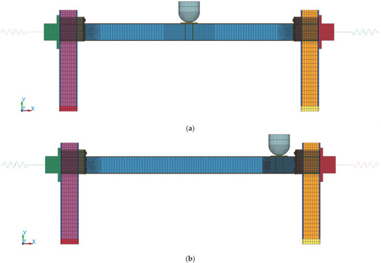 Finite element model established using ANSYS/LS-DYNA. (a) Mid-span impact scenario; (b) beam-end impact scenario.