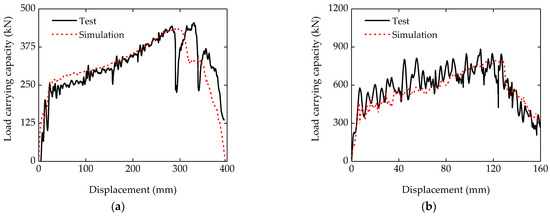 Comparison of load-carrying capacities–displacements curves between drop-hammer impact tests and numerical simulations. (a) Mid-span impact scenario; (b) beam-end impact scenario.