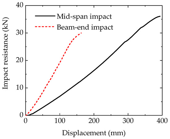 Based on Equation (7), the impact load-resisting mechanism of the specimens on the left side of the impact location is in line with that of the mid-span impact scenario. Figure 13a presents the impact resistance–displacement curves of the specimens on the left side of the impact location under the beam-end impact scenario. The tendency for the impact resistance provided by the left-hand part to decline as the SDR increases is similar to that in the mid-span impact scenario. When compared with the specimens having the same SDR in the mid-span impact scenario, the impact resistance provided by the specimens on the left side of the impact location under the beam-end impact scenario is substantially decreased. In the beam-end impact scenario, the span length L1 of the specimens on the left side of the impact location is nearly equal to the full span length, and the maximum displacement also drops significantly. This leads to a marked reduction in the impact resistance provided by the left-hand part, as shown in Table 4.