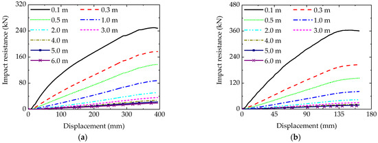 In the experiment, the falling height of the hammer is 3 m. To further investigate the influence of the falling height on the impact resistance of the steel-framed subassemblies, the parameter h in Step 5 is set to 0.5 m, 1.0 m, 2.0 m, 4.0 m, 5.0 m, and 6 m, respectively. All these heights are possible falling debris impact heights for actual steel-framed structures. The impact resistance–displacement curves of steel-framed subassemblies under various falling heights of hammer are shown in Figure 7.