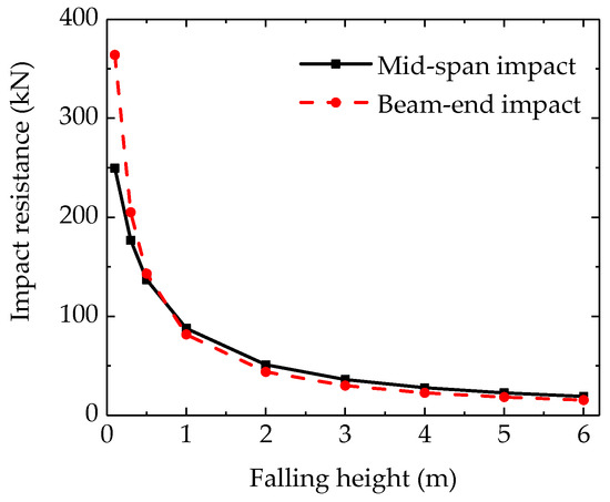 - Falling Height Effects: The impact resistance decreases with an increasing falling height, with the reduction ratio exceeding the theoretical 50% due to the additional gravitational potential energy conversion during post-impact deformation. For falling heights ≤ 0.5 m, beam-end impacts show better resistance, while mid-span impacts are advantageous for heights ≥ 1.0 m.