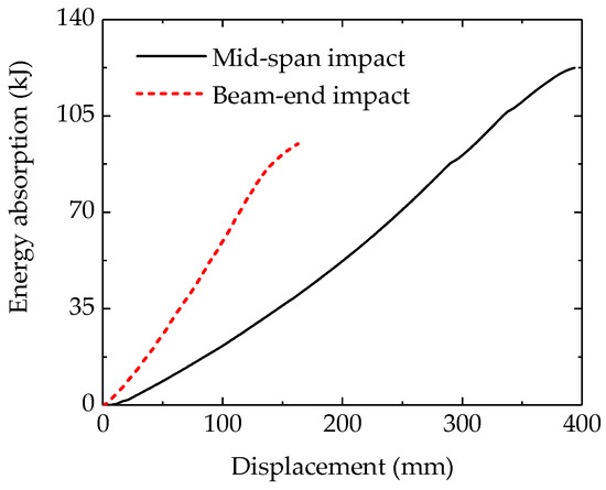 It is worth noting that the mid-span and beam-end impact scenarios had different SDRs. The numerical simulations indicated that when the SDR was greater than 16 in the beam-end impact scenario, the differences in the energy absorption capacity were relatively small. To display the numerical results more distinctly, in the beam-end impact scenario, the cases with SDRs of 20 and 28 were removed, and the case with an SDR of 10 was included.