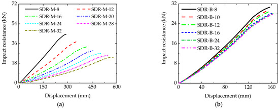 Under the mid-span impact scenario, significant differences can be observed among the impact resistance–displacement curves with different SDRs, as shown in Figure 10a. The curve for the specimen with a small SDR (e.g., SDR-M-8) shows a steep slope, with the impact resistance increasing rapidly as the displacement increases. This reflects that steel-framed structures can rapidly establish impact resistance during the deformation stage, which is attributed to the greater stiffness of steel beams under a small SDR. However, as the SDR increases (e.g., SDR-M-32), the curve slope becomes gentler and the growth rate of impact resistance decreases. This reflects that beams with a large SDR, due to reduced stiffness, require larger displacements to absorb sufficient impact energy and resist impact loads. Ultimately, the peak impact resistance of steel-framed subassemblies with a small SDR is significantly higher than that of those with a large SDR.