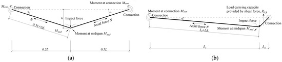 Under the mid-span impact scenario, according to the load-resisting mechanism shown in Figure 11a, the load-carrying capacity R can be expressed as follows: