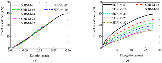 Effect of SDR on impact resistance under mid-span impact scenario. (a) Impact resistance–rotation curves; (b) impact resistance–elongation curves.