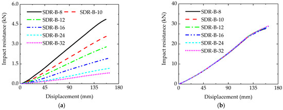 Effect of SDR on the impact resistance–displacement curves. (a) Mid-span impact scenario; (b) beam-end impact scenario.
