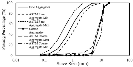 The concrete mix utilized locally sourced materials. The constituents per cubic meter were 450 kg of Portland general use (type GU) cement, 1090 kg coarse aggregates, 820 kg fine aggregates, and 245 kg water. Coarse and fine aggregates were compliant with ASTM C33 [31] specifications. Particle-size distribution for both aggregates was determined following ASTM C136 [32] procedures, and the results are presented in Figure 1. Aggregate bulk densities were measured using standard Proctor methods (ASTM C29 [33]), resulting in 1600 kg/m3 for coarse aggregate and 1820 kg/m3 for fine aggregate. The fine aggregate was at a saturated surface-dry condition with an average moisture content of 2.7%.