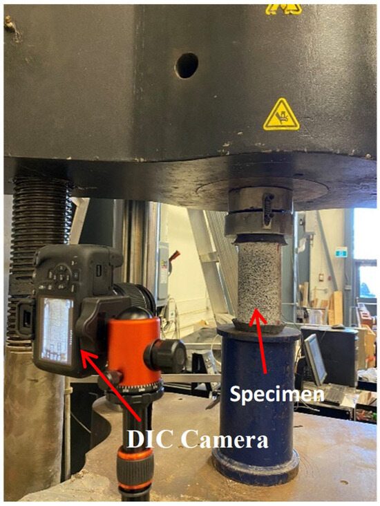 Compressive strength tests followed ASTM C39 [35] procedures, utilizing a 2 MN Instron hydraulic testing machine at a displacement-controlled rate of 1.58 mm/min. A loading plate was placed on the specimens to minimize eccentric loading. Two linear strain gauges (120 mm length) were attached to opposite sides of each specimen to measure axial strains. Figure 2 illustrates the compressive test setup. The same loading apparatus evaluated the split tensile strength according to ASTM C496 [36]. Digital image correlation (DIC) also analyzed deformation patterns and strain fields. Specimen surfaces were painted white, then speckled with a uniform black pattern. A Canon Rebel T7 camera (Canon, Taiwan, China) recorded deformation, with subsequent analysis performed using GOM Correlate 2022 software [37]. This DSLR camera had a 24.1 megapixel sensor, with a 1080p resolution (1920 × 1080 pixels) set at 30 frames per second.