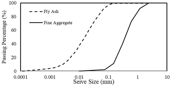 Particle size distribution for fine aggregates and fly ash used in scaled-down models.