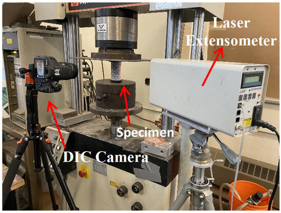 Compressive strength setup for the model specimen, depicting the utilization of the DIC and laser extensometer data acquisition systems.