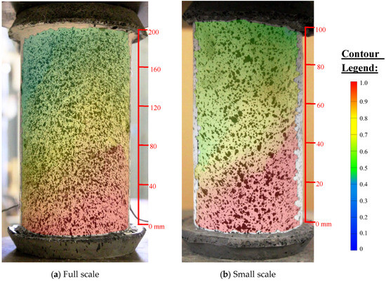The deformation fields captured using Digital image correlation (DIC) are illustrated in Figure 6 and Figure 7. For cylindrical specimens, Figure 6 shows that the strain is localized in a shear band near the middle of the height, approximately one diameter away from the end plates, an outcome typical of Type 4 failure per ASTM C39 [35], which is visually confirmed in Figure 8. This diagonal shear failure results from friction at the specimen ends restricting lateral expansion, concentrating shear stresses at mid-height.