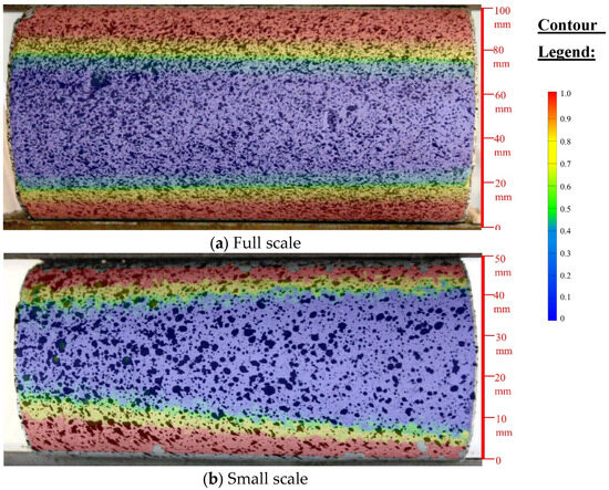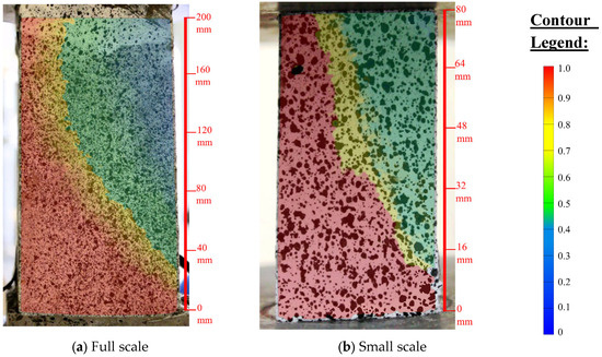 The split tensile behavior was investigated to confirm that the scaled concrete accurately replicates cracking patterns and failure mechanisms in tension. Figure 11 presents the normalized displacement fields for prototype and scaled-down specimens during split tensile testing. Both specimen types exhibited vertical cracking along the central axis, with similar displacement intensity regions and deformation patterns. The physical fracture surfaces shown in Figure 12 further affirm this similarity, with both models and prototypes failing by bifurcation initiated by microcracks along the aggregate–matrix interface.