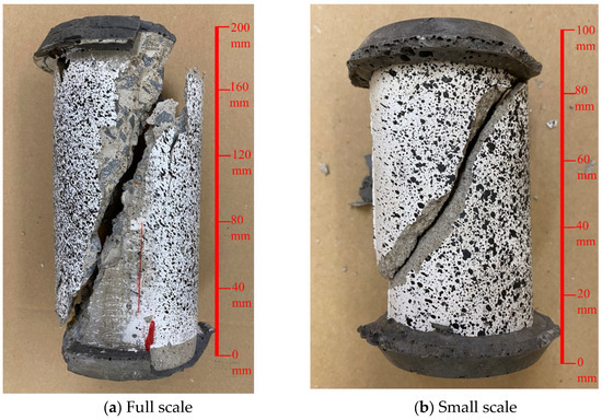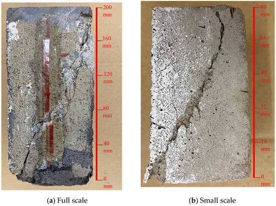 Figure 7 depicts inclined cracking for prismatic specimens, consistent with forming a shear damage belt. The fracture surfaces in Figure 9 clearly show macroscopic inclined cracks passing through the mortar matrix and along aggregate boundaries. These cracks developed as adhesive cracks expanded and linked with internal cracks in the cement paste, forming the final failure surface. Such behavior aligns with observations by Cedolin et al. [48] and Van Mier [49], who demonstrated that crack coalescence and strain-softening govern tensile failure in concrete. Similarly, Bažant and Planas [50] highlighted that fracture processes are strongly size-dependent, and accurate similitude requires scaled models to capture both pre-peak microcracking and post-peak softening. Recent studies using micro-CT and DEM simulation [51] further confirm that aggregate size distribution influences crack initiation and propagation during splitting tests. The agreement between our scaled and prototype fracture patterns, therefore, confirms that the proposed mix design successfully reproduces critical fracture mechanisms, not only global stress–strain response.