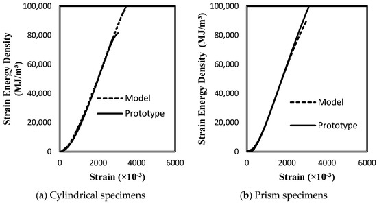To further assess the scaled model’s accuracy, strain energy density was calculated for both specimen types and compared to prototype results after applying the appropriate scale factor for energy density under Froude similitude (i.e., ). As shown in Figure 10, the scaled energy density curves of the model specimens closely matched those of the prototype throughout both the elastic and inelastic deformation ranges. This agreement confirms that the model replicates stiffness and strength and mirrors the energy absorption characteristics of full-scale concrete.