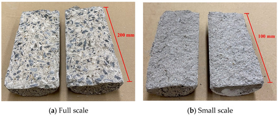 Due to the focus on mechanical behavior rather than absolute force measurements, the selected dimensions ensured geometric compatibility with the prototype specimens while maintaining manageable sizes for laboratory testing. Importantly, 92% of the aggregate size in the full-scale mix was below 13 mm; therefore, the scaled-down mix was designed such that approximately 92% of its aggregates were smaller than 1.3 mm. This scaling maintained a 1:10 similitude in aggregate size and prevented dimensional distortion, as shown by the comparison between Figure 1 and Figure 3.