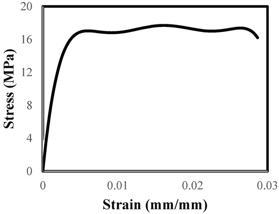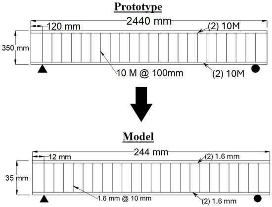 The required number of reinforcement wires in the scaled-down beam was computed by scaling down the total yielding force in the prototype reinforcement [15,52,53]. The detailing of the model beam followed the minimum reinforcement ratio requirements stipulated in CSA A23.3 [30]. The mechanical response of the chosen model reinforcement material is illustrated in Figure 15, confirming its suitability for achieving the desired yield behavior in the scaled domain.