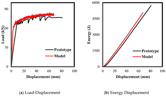The experimental results in Figure 18a show the load–displacement responses of both the prototype and model beams. The full-scale beam reached an ultimate load capacity of approximately 79 kN. The scaled-down beam reached a corresponding ultimate load of 84.5 N, which, when scaled up by the force scale factor of 1000, equates to 84.5 kN, demonstrating only a 7% deviation from the full-scale result. This close agreement validates the scaled model’s accuracy in replicating the prototype’s load-bearing capacity.