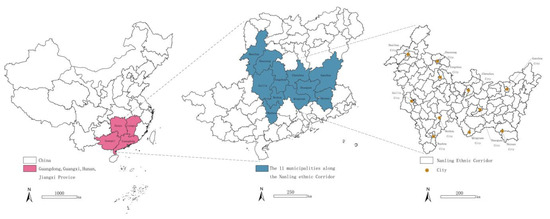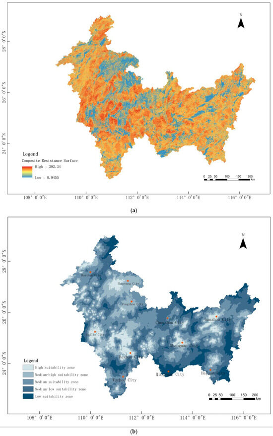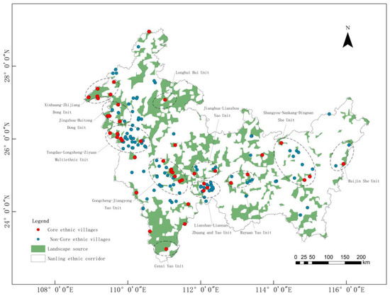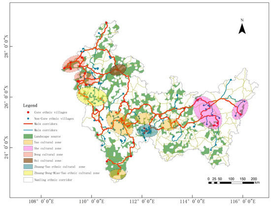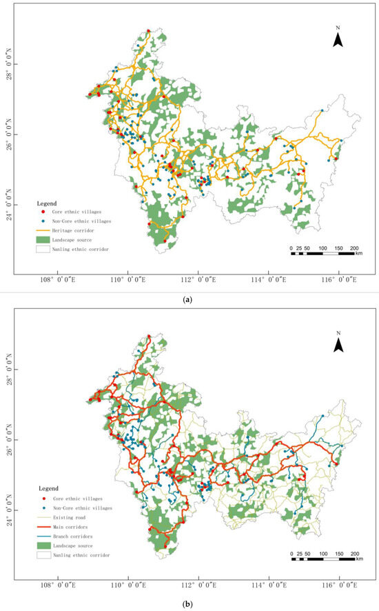 To address the challenges of the loss of ethnic cultural carriers and the spatial fragmentation of landscape management due to rural population shrinkage, constructing heritage corridors has emerged as a crucial strategy for integrating fragmented resources, enhancing cultural landscape connectivity, and improving functional resilience. Using the Nanling Ethnic Corridor in China as a case study, this research proposes an integrated method combining Landscape Character Assessment (LCA), Morphological Spatial Pattern Analysis (MSPA), and the Minimum Cumulative Resistance (MCR) model, aiming to construct a landscape heritage corridor network for ethnic villages. Firstly, LCA was employed to identify 12 categories of landscape characters, followed by a multi-dimensional value evaluation to determine high-value landscape areas. Subsequently, MSPA was used to extract core landscape patches, and the importance of these patches was assessed by combining connectivity indices (dIIC, dPC), resulting in the identification of 48 key landscape source areas. Finally, the MCR model was applied to generate potential corridors, and a heritage corridor network was formed through the optimization of topological nodes. The results indicate that (1) the heritage network consists of 48 source areas and 151 corridors, forming a structure with “two vertical and one horizontal” main axes and a circular branch network; (2) spatial distribution of source areas and corridors exhibits aggregation in the central and western regions and sparsity in the southeast, closely aligning with the distribution of ethnic villages and high-value landscape areas; (3) the optimized corridor network significantly improves the connection efficiency and resilience of cultural nodes. This study provides a scientific foundation for the systematic conservation, spatial optimization, and sustainable development of cultural heritage in ethnic regions experiencing population shrinkage. Full article