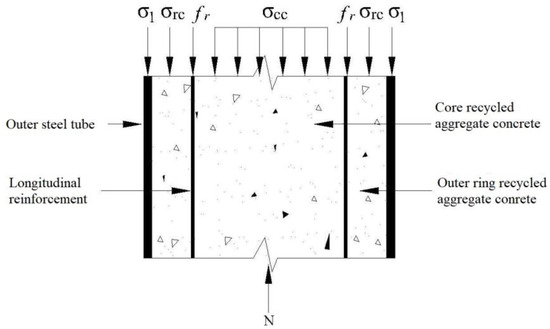 To advance the application of sustainable recycled aggregate concrete (RAC) in bridge engineering, this study introduces a novel reinforced RAC-filled circular steel tubular (RRACFCST) column, leveraging the dual confinement of an external steel tube and an internal reinforcement cage. Its primary novelty is a comprehensive analytical framework integrating a new theoretical model by using limit analysis, ferrule theory, and the twin shear unified strength theory. Then, a rigorously validated nonlinear finite element model that incorporated material nonlinearity and interface effects was used to validate the proposed theoretical model. The results demonstrate the significant performance of the steel reinforcement cage, which enhanced the axial bearing capacity by 17.86%, and an optimal recycled aggregate replacement rate of 70% yielded the bearing capacity, with 100% replacement still achieving a 13.3% higher capacity than unconfined conventional concrete, demonstrating how effective confinement can compensate for and overcome the inherent deficiencies of RCA. Conversely, larger diameter–thickness ratios would reduce the strength by 33.7%. These quantifiable findings provide critical design insights and a validated predictive tool, establishing the RRACFCST column as a promising and high-performance sustainable solution for bridge structures. Full article