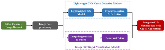 The durability and safety of modern concrete architecture and infrastructure are critically impacted by early-stage surface cracks. Timely and appropriate identification and management of these cracks are therefore essential to enhance structural longevity and stability. This study utilizes computer vision technology to construct a large-scale database, comprising 106,998 concrete surface crack images from various research sources. Through data augmentation, the database is extended to 140,000 images to fully leverage the advantages of deep learning models. For concrete surface crack detection, this study proposed a lightweight convolutional neural network (CNN) model, achieving 92.27% accuracy, 94.98% recall, and a 92.39% F1 score. Notably, the model runs smoothly on lightweight office notebooks without GPUs. Additionally, an image stitching algorithm that seamlessly stitches multiple images was proposed to generate high-quality panoramic views of bridges. The image stitching algorithm demonstrates robustness when applied to multiple images, successfully achieving stitching without visible seams or errors, providing efficient and reliable technical support for bridge panorama generation. The research outcomes demonstrate significant practical value in bridge inspection, providing robust technical support for safe and efficient bridge inspection. Moreover, our findings offer valuable references for future research and applications in related fields. Full article