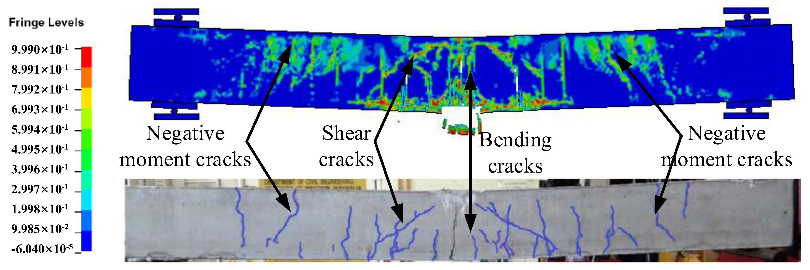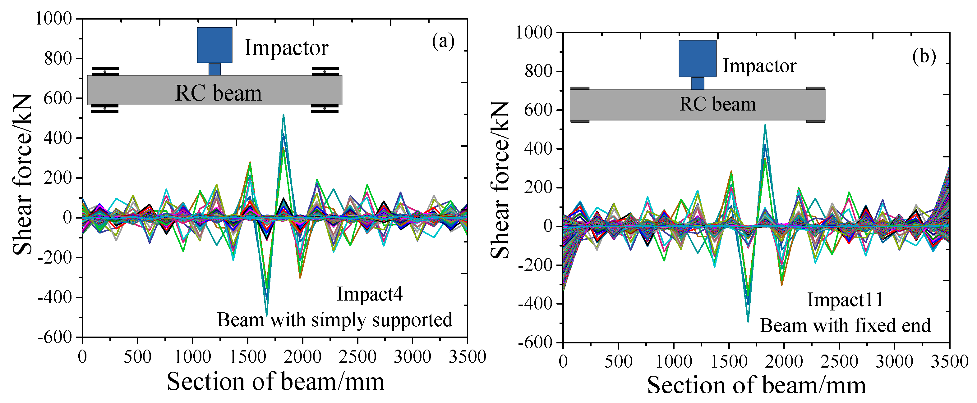 - Under impact loads, the failure mode of the beams is subjected to a negative bending moment, and for fixed- boundary conditions, significant end shear leads to the formation of vertical cracks.