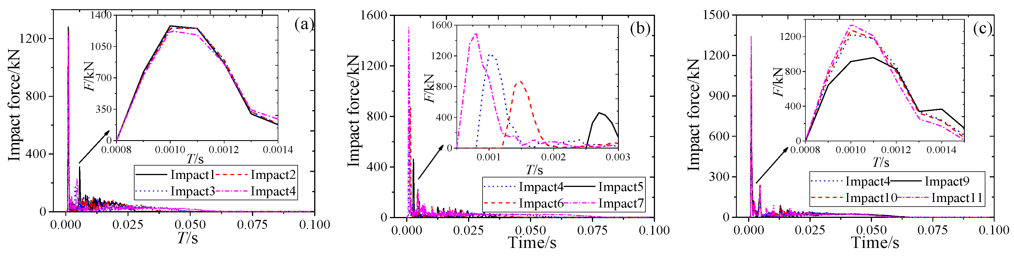 - Li, H.W.; Chen, W.S.; Hao, H. Influence of drop weight geometry and inter layer on impact behavior of RC beams. Int. J. Impact Eng. 2019, 131, 222–237. [Google Scholar] [CrossRef]