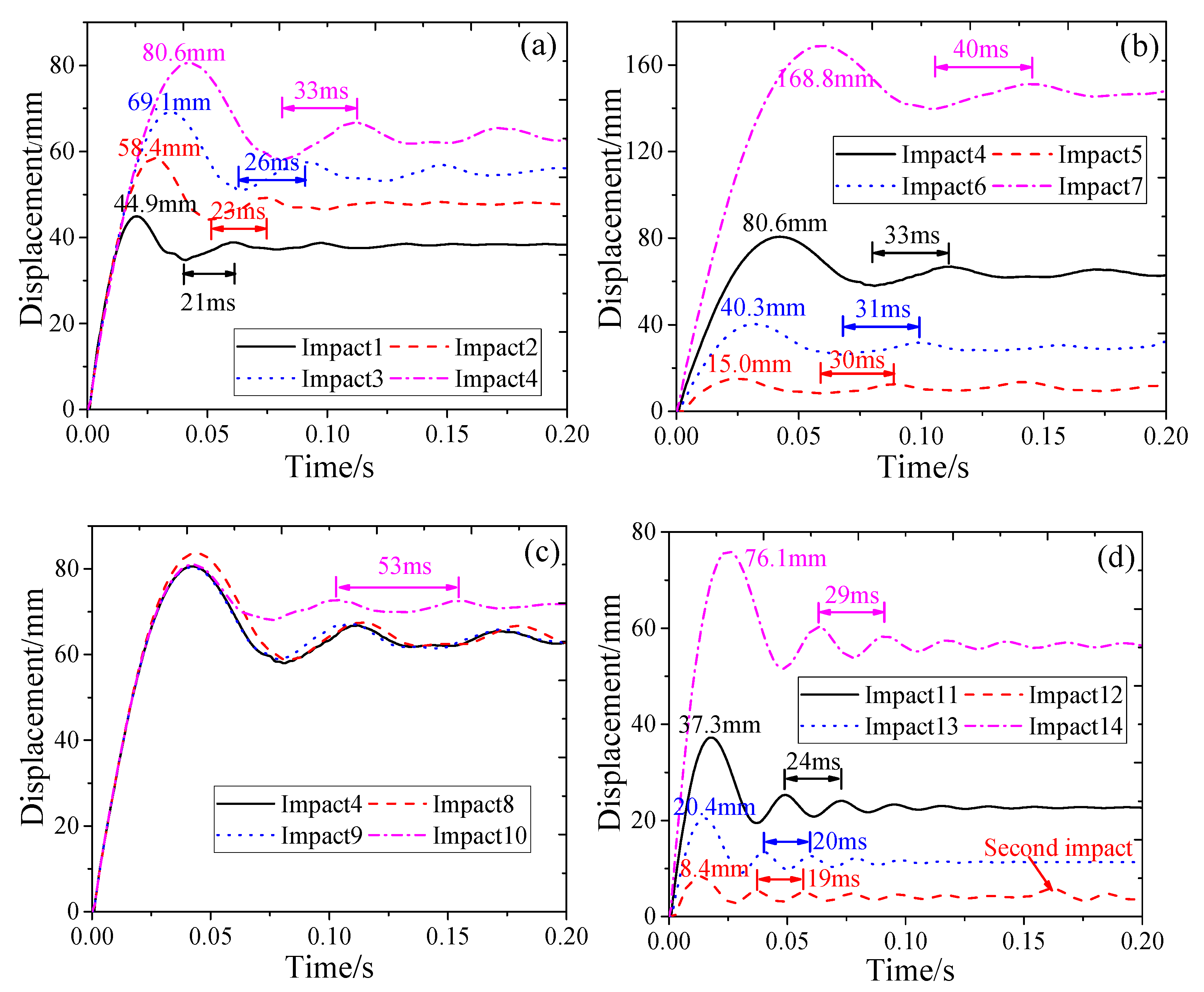 - The boundary conditions of RC beams have no remarkable effect on the impact force of RC beams but have a noticeable effect on the peak displacement and residual displacement. The vibration period of fixed- boundary RC beams is significantly shorter than that of simply supported beams.