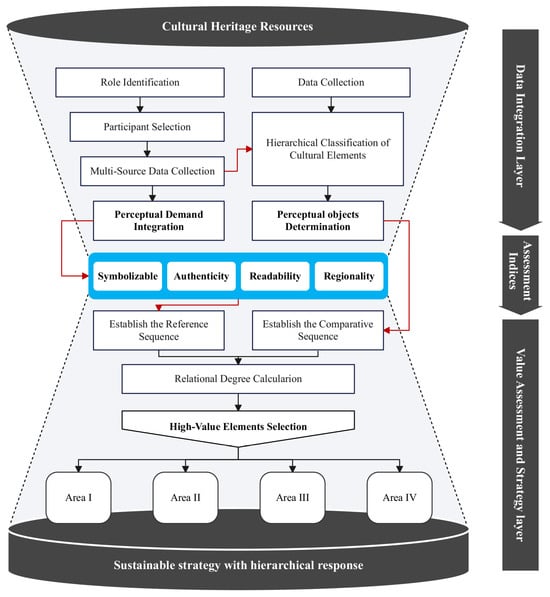 To address these limitations, this study proposes a perceived demand-driven framework for assessing the value of heritage elements and facilitating tiered decision-making. The framework centers on a sandglass tiered model, dynamically collecting heritage elements by integrating the perceptual demands of multi-stakeholder groups, and innovatively combines the Analytic Hierarchy Process (AHP) with Grey Relational Analysis (GRA). Firstly, we established a hierarchical structure through perceptual demand analysis, quantifying and balancing the conflicting perceptual demands from multi-stakeholder groups. Secondly, the GRA is applied to transform these ambiguous perceptual demands into quantifiable evaluation indices, thereby constructing a reference sequence. Then, we systematically collect and screen heritage resources according to hierarchical demands, forming a comparison sequence composed of elements that align with public perceptual demands. Finally, tiered response strategies are formulated based on the value assessment outcomes. This study contributes to the existing literature by proposing some original approaches to the research issue. First of all, by dynamically integrating public perceptual demands into heritage resource collection, our approach breaks the traditional expert-centered model, balancing authenticity preservation with diverse cognitive adaptation. The second major contribution is the construction of a sandglass tiered model, which offers an actionable pathway for integrating uncertain demands and assessing the value of diverse heritage elements within complex systems. In summary, this study establishes a transformative framework structured around “demand integration-resource collection-value assessment-tiered response strategies.” This framework provides decision-making support for urban renewal that integrates heritage sustainability with community experience, offering both theoretical and practical significance.