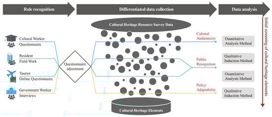 The data collection layer refers to the collection and organization of data on the perceived subjects and objects. We identify stakeholder roles and locate multi-stakeholder perception groups, obtaining and analyzing perception demand data through a multi-source data gathering method. Then, we analyze and categorize cultural heritage resources using a categorization system for heritage elements, clarifying the perceived subjects and objects of cultural heritage resources. The cultural heritage resources at this layer have undergone initial screening according to the demands of multi-stakeholder groups. The discovered heritage elements, regarded as perceptual objects, have initially met the perceptual demands of four distinct groups.