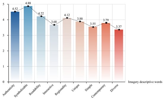 Once the perceptual demands of the four stakeholder groups are identified, the complexity of the demand description hinders future calculations. Therefore, the Kansei Engineering method was used to decode each perceptual demand into imagery descriptive words. Expert Group A was invited to describe the perceptual demands of four distinct groups using one or more words. Redundant or highly similar words were subsequently eliminated. Since cultural imagery words require repeated assessment for a relatively accurate evaluation index, the remaining cultural imagery words were then assessed individually using a five-point Likert Scale to ensure stylistic consistency []. Those words with higher mean scores were selected as evaluation indices for heritage symbol elements. As shown in Figure 3, we sorted the average values of all words from highest to lowest and selected “symbolizability (4.88), authenticity (4.52), readability (4.22), and regionality (4.12)” as the indices for the symbol value assessment of cultural heritage due to their higher average values. These four evaluation indices, derived through the collection and integration of demands, as well as the identification and quantification of indices, serve as the assessment criteria for demand-driven heritage management and form the reference sequence for subsequent relational analysis.
