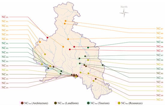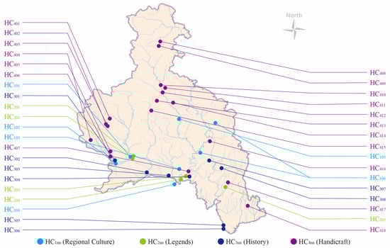 The cultural heritage resources of Yiling are scattered in distribution, with each element showing significant regional features. We systematically collected cultural heritage elements of Yiling using a multi-source data collection approach and integrated the perceptual demands of multi-stakeholder groups into the selection process. First, we compile data from fieldwork and demands from cultural workers to identify 71 unique elements of Yiling cultural heritage. Figure 4 and Figure 5 illustrate the inclusion of 34 elements of natural cultural heritage and 37 elements of historical cultural heritage.