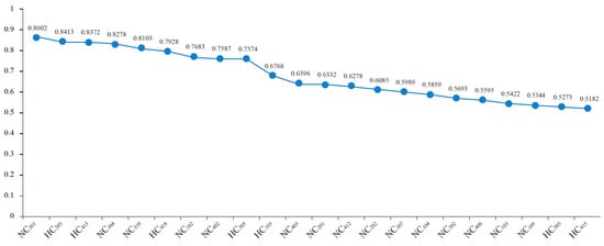 The 42 heritage elements that meet public perception demands serve as evaluation objects, denoting the comparison sequence. The average value of the evaluation indices, EHL0, serves as the reference sequence. We briefly describe all the elements of cultural heritage. Group A of experts is asked to score the 42 heritage elements in the comparable sequence and calculate the average for each index, as shown in Table 3. All four indices are positive indicators and exhibit a positive correlation with the comparative sequence. To ensure the recognizability and efficacy of cultural heritage symbols, heritage elements with an average value of 7 or less are eliminated.