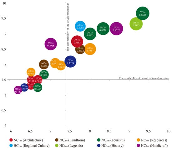 We invited government workers to conduct semi-structured interviews, compared the findings with rankings, and then determined the zoning of heritage elements. The interview discussed two topics: the usefulness of industrial transformation and the adaptability of cultural development planning. Government workers were asked to assess the priority heritage elements individually, taking their average values as the X and Y coordinates and using the gray relational degree to determine the size of the bubbles for a scatter plot. If the axis data and bubble area show a positive correlation, it verifies that the public perception-driven cultural heritage symbol value assessment can effectively resolve group cognitive differences.