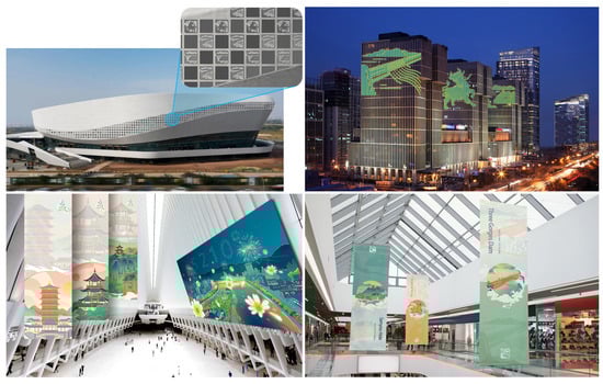 We use design techniques like symbol extraction and illustration design to transform heritage elements into visual forms. As shown in Figure 8, simplified heritage symbols are applied to building exteriors, contributing to an urban cultural atmosphere through the use of distinctive architectural materials and light-shadow techniques. Illustration design, which carries richer cultural connotations and attribute information, can improve public engagement and recognition when applied to interior spaces.