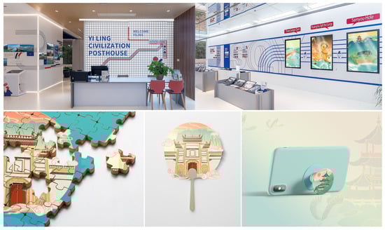 In addition, we are identifying shared attributes of cultural heritage in Area I to develop thematic cultural experience spaces. Figure 9 shows how we use spatial layout and design schemes to make the experience spaces more distinctive. We also design a series of creative and cultural products (CCPs) to enhance the immersive interactive experience. User interactions with these products, through photo-taking, social media sharing, and online commentary, amplified the cultural influence of cultural heritage. These participatory activities further expanded dissemination channels.